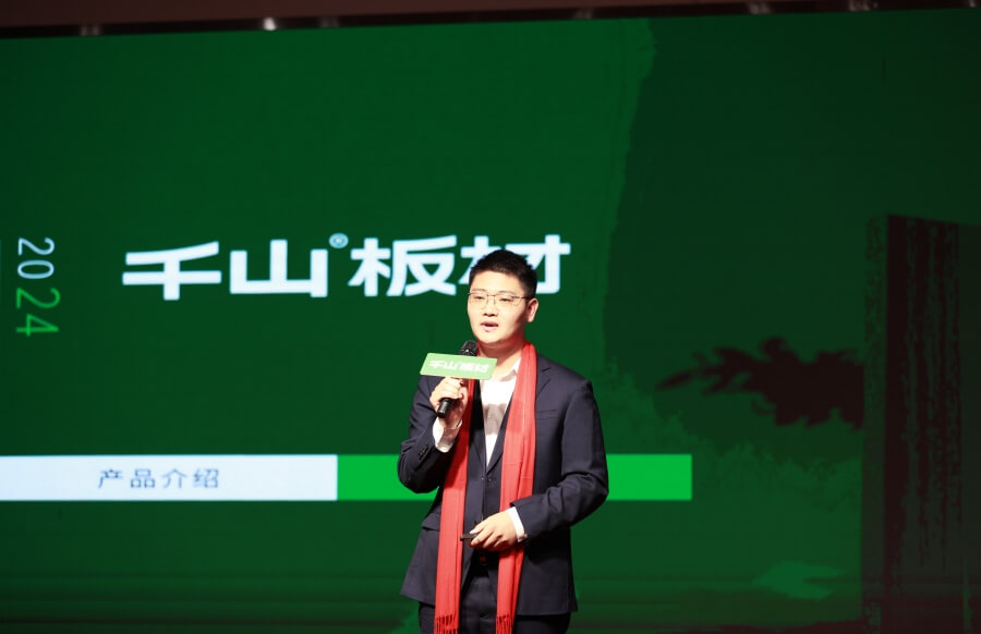 經銷商大區經理王殿忠為大家介紹了千山板材的產品體系,包括全品類板材、室內門、免拉手門板及門墻柜一體配套等,詳細闡述了千山在環保、工藝等方面的產品優勢。
