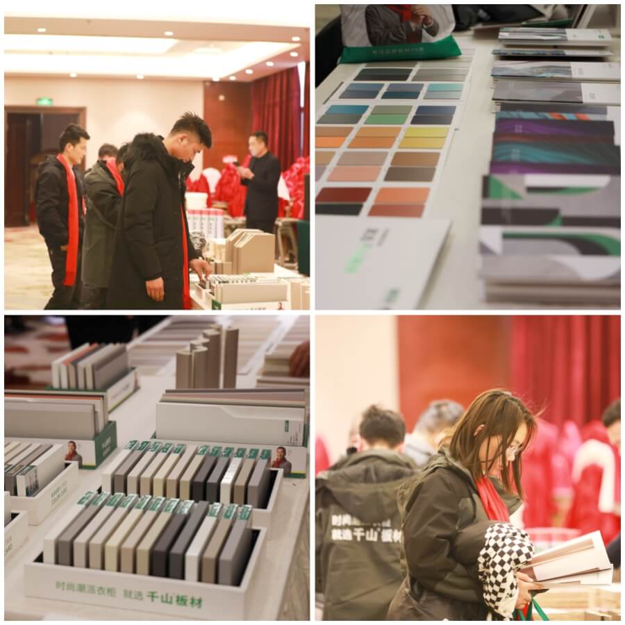活動現場設置了產品、樣冊、花色展示區,讓參會嘉賓們零距離感受千山板材的產品魅力,全方位了解千山板材的品類優勢和產品優勢。