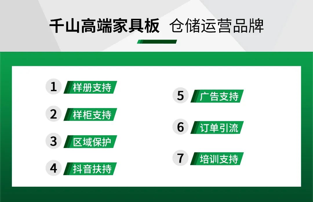千山擁有完善的加盟體系,全國“一縣一代”火熱招商,更有樣冊支持、樣柜支持、區域保護、抖音扶持、廣告支持、訂單引流、培訓支持7大政策支持,全方位助力經銷商伙伴贏戰終端市場。