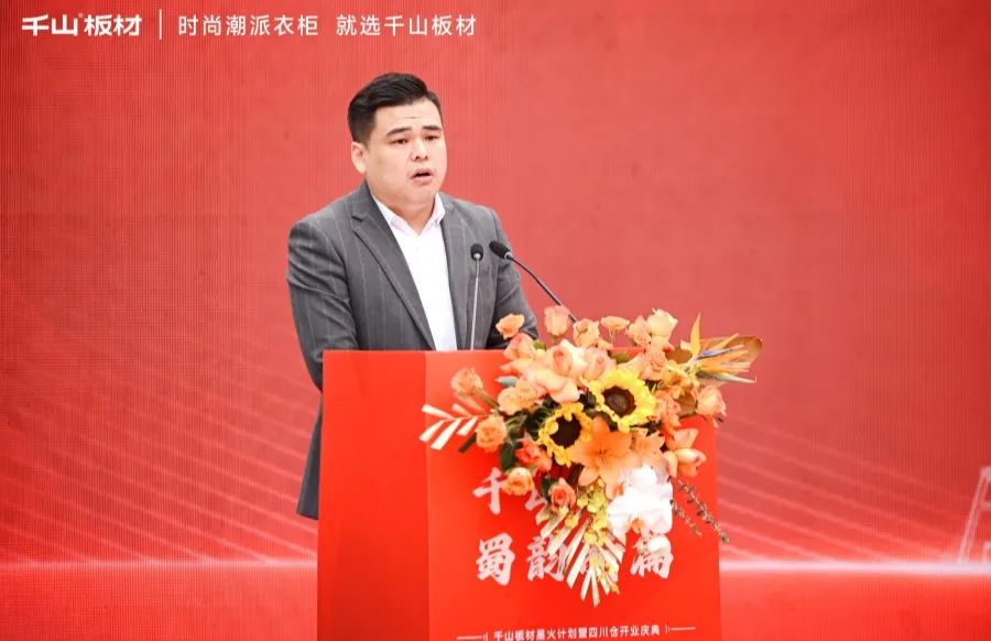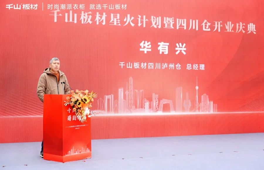 千山板材優(yōu)秀經(jīng)銷商代表,四川瀘州倉總經(jīng)理華有興上臺(tái)致辭。華總分享到,在集團(tuán)總部和區(qū)域合作伙伴的支持與努力下,千山板材在瀘州地區(qū)的市場(chǎng)占有率逐年攀升,品牌影響力日益增強(qiáng)。未來,將繼續(xù)加強(qiáng)合作,共同應(yīng)對(duì)市場(chǎng)挑戰(zhàn),實(shí)現(xiàn)互利共贏。