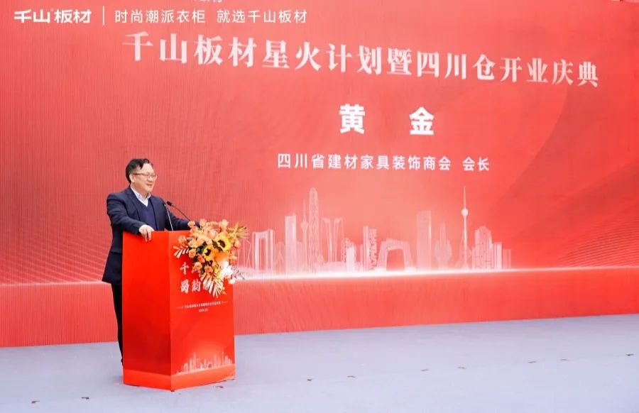 四川省建材家具裝飾商會(huì)會(huì)長黃金先生發(fā)表致辭。黃會(huì)長表達(dá)了對(duì)千山板材四川倉的美好期許和祝愿,并表示四川家具市場(chǎng)的繁榮與發(fā)展,離不開千山板材等一眾優(yōu)秀供應(yīng)鏈品牌的入駐與支持,也希望四川倉合力共上,迎來高質(zhì)量發(fā)展。