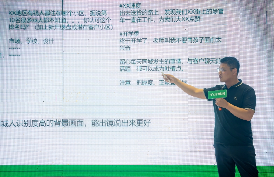 千山板材大區(qū)經(jīng)理王殿忠致辭。王經(jīng)理分享到,行業(yè)競爭壓力存在的同時也涌現(xiàn)出了機遇,千山將與伙伴們一起抓住機遇,形成事業(yè)共同體,多維度進擊,多渠道拓展,最終轉(zhuǎn)化為效益增長。
