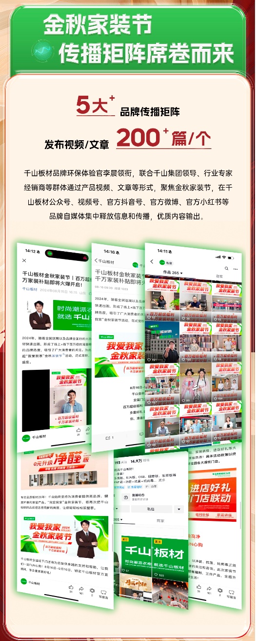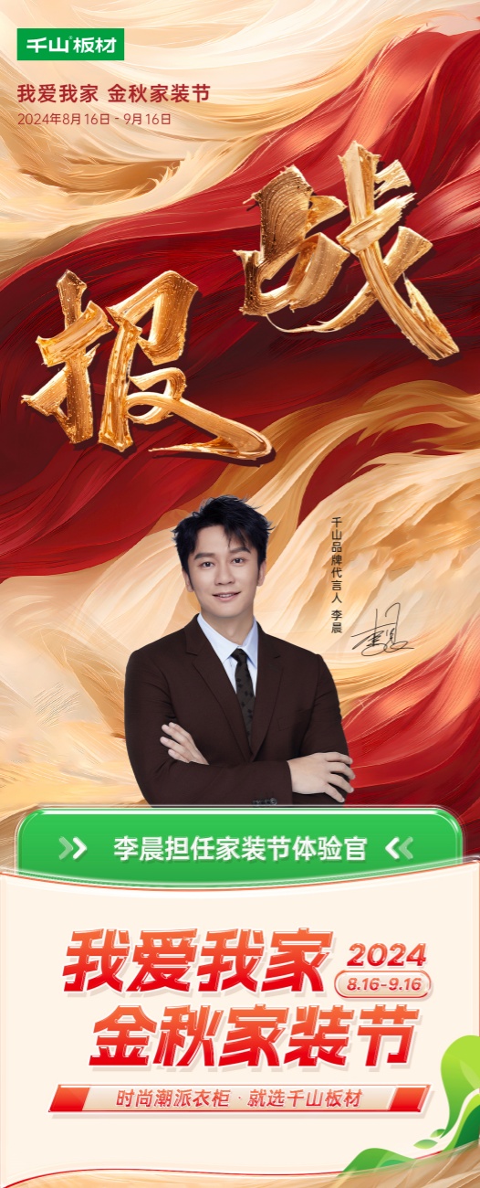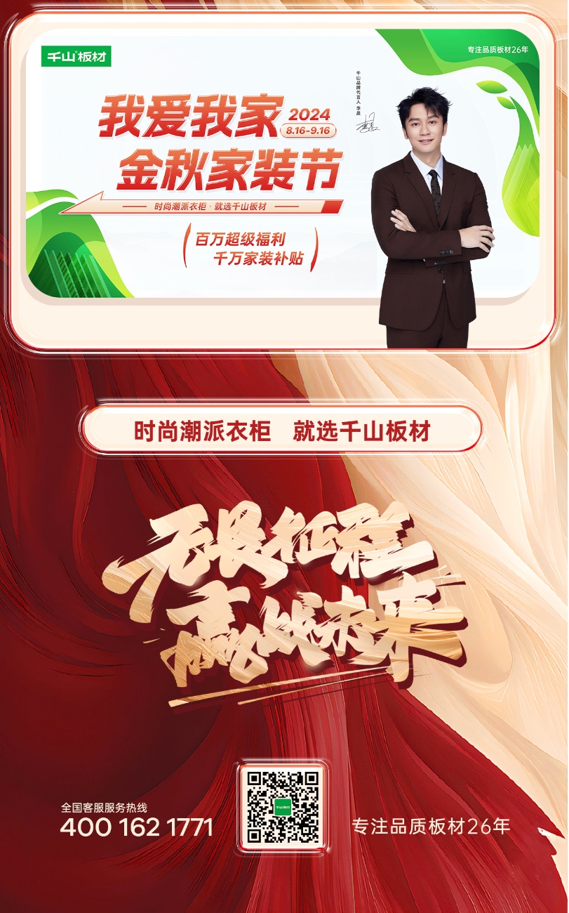 816日,千山金秋家裝節(jié)火爆上線,截至916日,為期30天的家裝節(jié)活動(dòng)日前正式落下帷幕。活動(dòng)期間,千山板材全國(guó)1500+門(mén)店聯(lián)動(dòng),全網(wǎng)曝光量超8500萬(wàn)、線上直播觀看量超2000萬(wàn)、簽約數(shù)量達(dá)3500+實(shí)現(xiàn)了品牌聲量和銷售業(yè)績(jī)的雙豐收!
