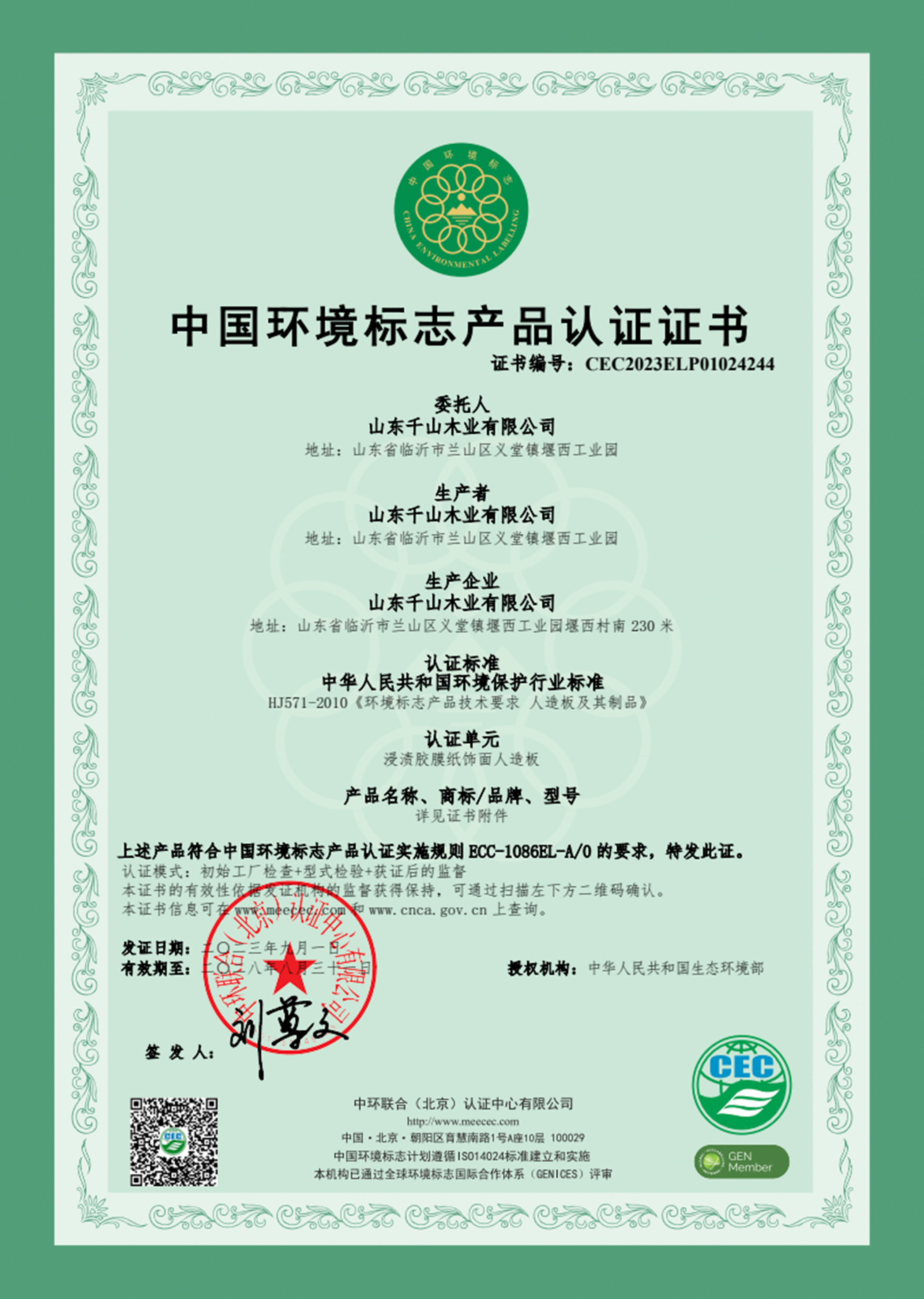 2019年,千山無醛級大豆膠板材成功上市,引領板材行業進入植物豆膠新時代通過了國內最高級別的環保產品認證——中國環境標志產品認證(十環認證),并獲得中國綠色產品認證證書、環境管理體系認證證書、質量管理體系認證證書;2023年千山再次順利通過“全球最嚴苛的”森林認證——FSC森林認證