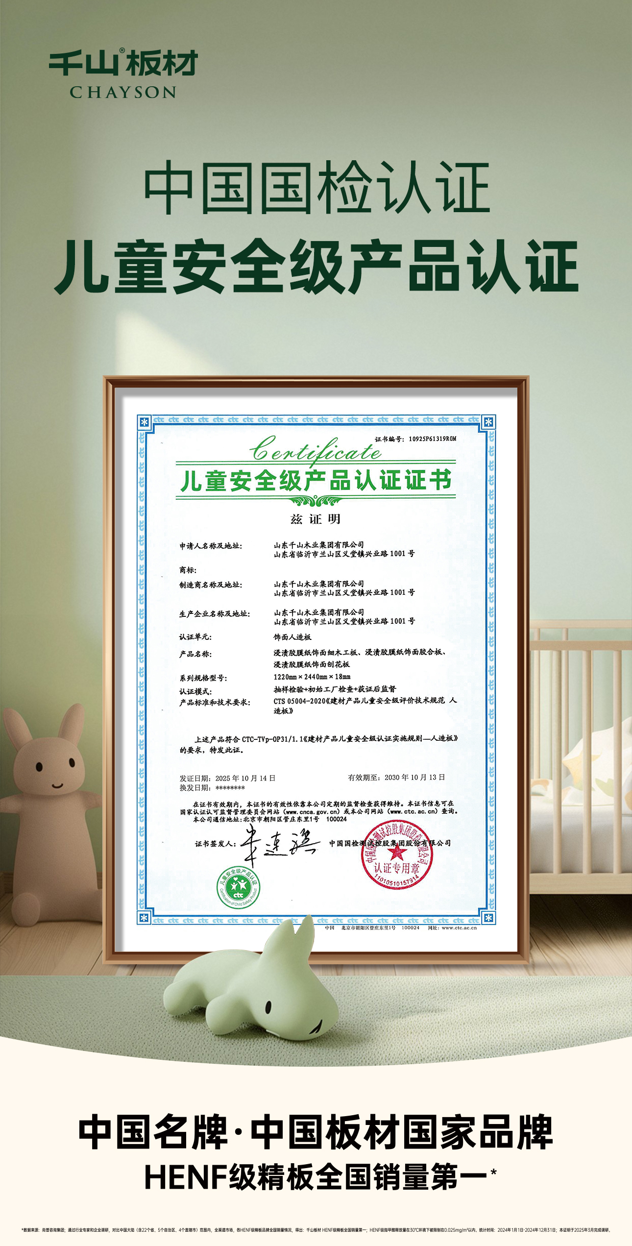 兒童安全級產品認證是當前國內針對兒童用品及兒童活動空間相關材料的頂級安全認證之一。兒童的呼吸系統更為脆弱,免疫系統尚未完善,對甲醛等有害物質的抵抗能力更弱,因此認證流程復雜繁瑣,檢測項目全面細致,標準更是嚴苛到極致,目的就是篩選出真正對兒童無害、具備高度安全性的優質產品。而千山板材以優于國家標準的環保性能,成功通過了這項嚴苛的評估。