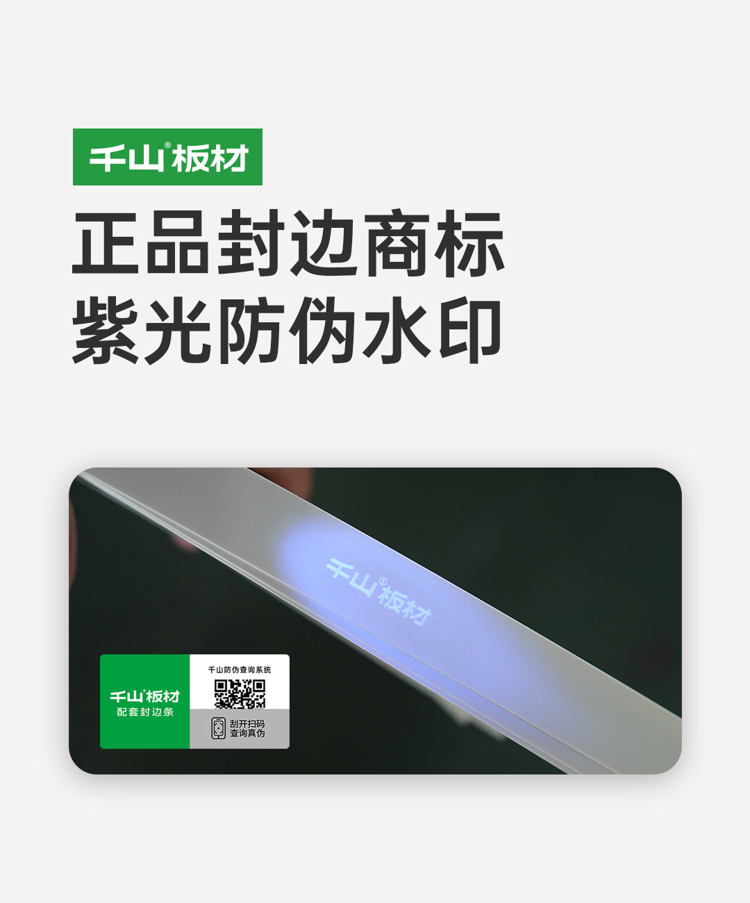 正品配套封邊皮有千山板材防偽商標,刮開圖層后可掃碼查詢真偽;用紫光照射查驗,顯示“千山板材”防偽水印。