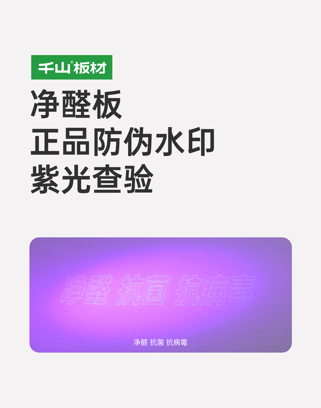 正品千山板材表面都印有隱形防偽標識,使用紫光手電筒照射板材表面,顯現“千山板材” 或 “千山板材ENF”水印,凈醛板顯現“凈醛 抗菌 抗病毒”水印。