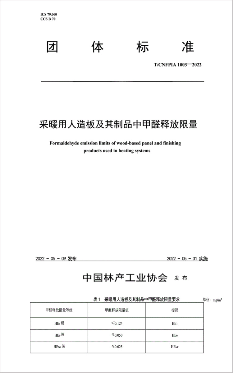2022年5月31日開始實(shí)施的T/CNFPIA1003—2022《采暖用人造板及其制品中甲醛釋放限量》文件,對(duì)甲醛釋放量有三個(gè)分級(jí),分別為HE1(≤0.124mg/m3)、HE0(≤0.050mg/m3)、HENF(≤0.025mg/m3)。