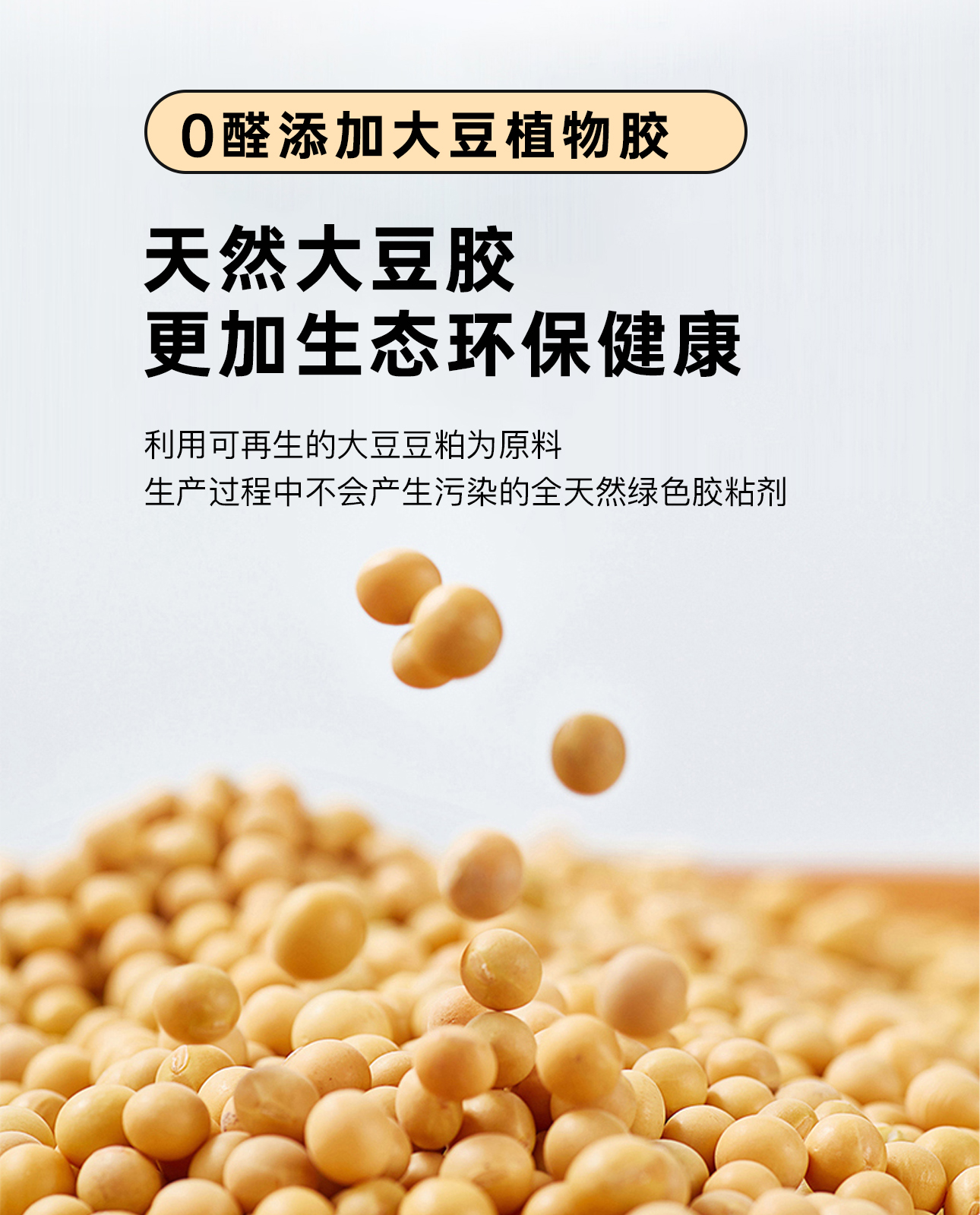 在板材生產過程中必然要用到膠水,市面上不乏使用有醛膠粘劑的產品,會不可避免的釋放甲醛、苯酚等有害物質。大豆植物膠是利用可再生大豆豆粕為原料,以水為分散介質,生產過程不會產生污染的全天然綠色膠粘劑,從源頭杜絕了甲醛、苯酚等有害物質的釋放。