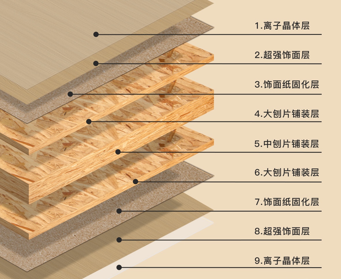 定向鋪裝芯層+固化層+離子晶體層,穩(wěn)定堅(jiān)韌結(jié)構(gòu)能夠經(jīng)受南北方環(huán)境考驗(yàn),規(guī)避門(mén)板變形和表層開(kāi)裂問(wèn)題。