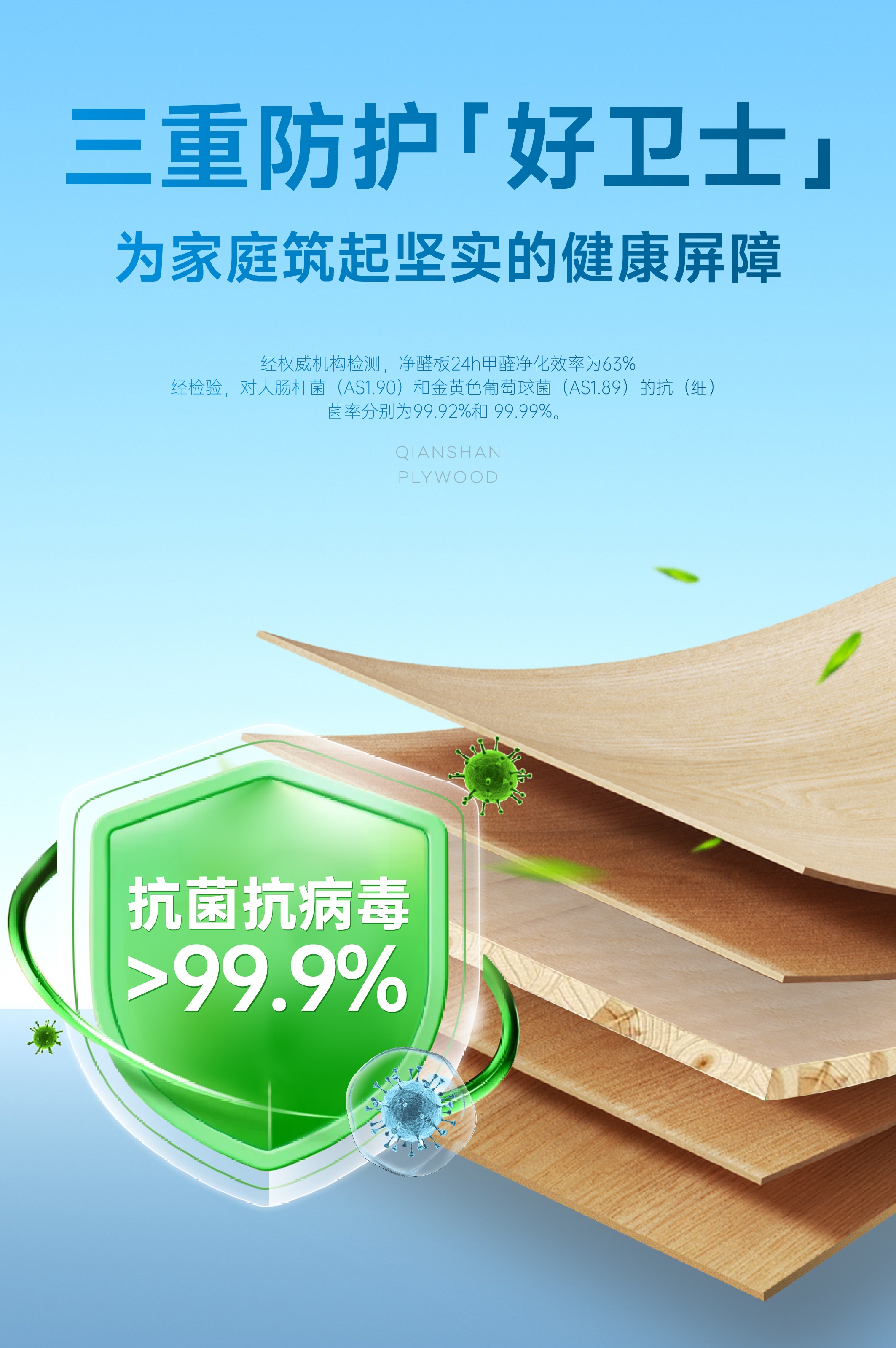 在HENF級和F4星雙環保標準之上,千山板材具有凈醛、抗菌、抗病毒三重防護。經權威機構檢測,凈醛板對大腸桿菌(AS1.90)和金黃色葡萄球菌(AS1.89)的抗(細)菌率分別為99.92%和99.99%。對甲型流感病毒H1N1的抗病毒活性率為>99.9%。