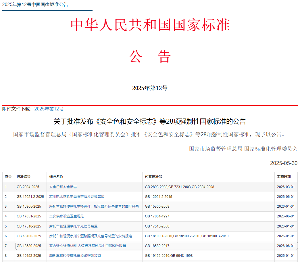 2025年5月30日,強制性國家標準GB 18580-2025《室內裝飾裝修材料 人造板及其制品中甲醛釋放限量》正式發布,定于2026年6月1日正式實施,替代已經實行8年的GB 18580-2017標準。